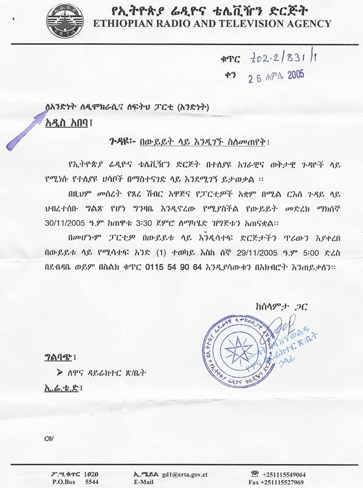 ኢቲቪ አንድነት ፓርቲን ጨምሮ ለተለያዩ ፓርቲዎች ደብዳቤ የላከ ሲሆን አንድነት ፓርቲ በበኩሉ በ5 የክልል ከተሞች ለሚያደርገው ህዝባዊ ንቅናቄ አመራሮቹን ስላሰማራ የውይይት መድረኩ እንዲራዘምለት ጥያቄ አቅርቧል፡፡ አንድነት ፓርቲ የሚሊዮኖች ድምፅ ለነፃነት በሚል መሪ ቃል የጀመረው ህዝባዊ ንቅናቄ በስኬት እየተካሄደ መሆኑ ይታወቃል፡፡#millionsofvoicesforfreedom #Ethiopia #UDJ